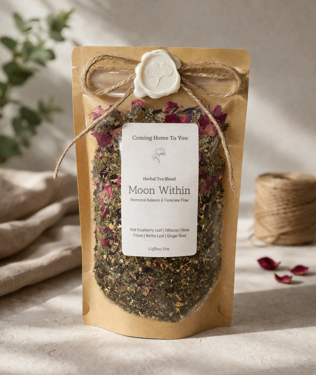 Moon Within is a caffeine-free herbal blend created to support hormonal balance, feminine flow, and deep nourishment from within. Rooted in traditional herbs known for women’s wellness, this blend works quietly with your body — supporting you through your cycles, emotions, and everyday fluctuations.